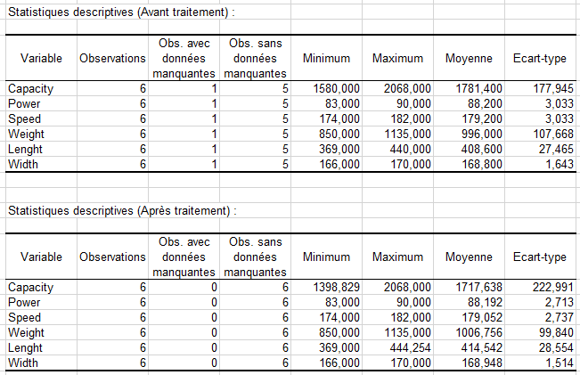 Les statistiques descriptives sont affichées (un tableau avant la complétion et un après la complétion).