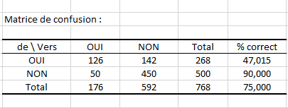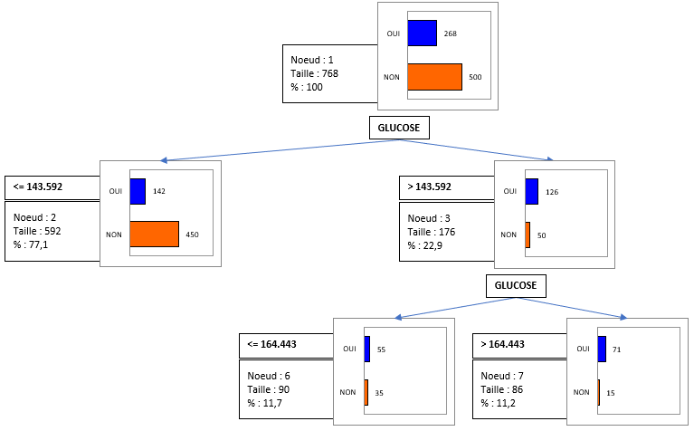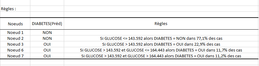 Ainsi nous voyons que : "Si Glucose <= 143.592 alors Diabète = NON dans 77,1% des cas", cette règle est vérifiée pour 592 individus (77% des données) avec une pureté au niveau du nœud de 76,01% comme indiqué dans le tableau structure de l’arbre.