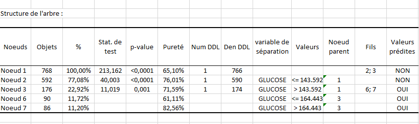 Vient ensuite la structure de l'arbre sous forme de tableau. Il décrit pour les différents nœuds, le nombre d'objets au niveau de chaque nœud, le % correspondant, la statistique de test pour la scission de ce nœud, la pureté qui mesure le % d'observations se trouvant dans la classe (ou modalité) dominante au niveau du nœud, les nœuds parents et fils, la variable de séparation, la ou les valeurs correspondantes (des intervalles pour les variables quantitatives explicatives), et la classe prédite par le nœud.
