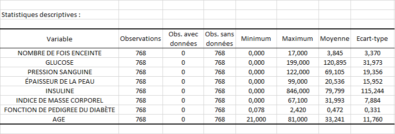 Les données proviennent à l'origine de l'Institut national du diabète et des maladies digestives et rénales. L’objectif du tutoriel est de prédire si un patient est atteint ou non de diabète sur la base de certaines mesures diagnostiques incluses dans le jeu de données. Tous les patients de cette étude ont au moins 21 ans et sont issus du groupe des indiens Pimas (peuple de Nord-Amérindiens originaires du Mexique et du Sonora). Le jeu de données comprend plusieurs variables prédictives médicales (indépendantes) et une variable cible (dépendante) : Diabète. Les variables indépendantes incluent le nombre de grossesses du patient, son IMC, son niveau d'insuline, son âge, etc.