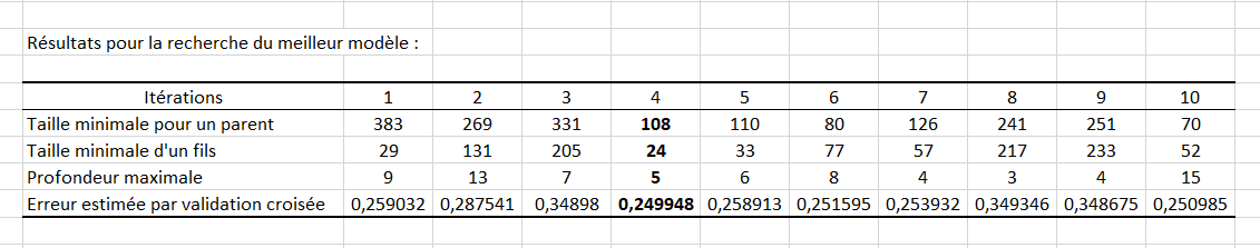 Viens ensuite le tableau qui présente l’ensemble des paramètres testés pour notre modèle et ceux sélectionnés (en gras), avec leur score de validation croisée respectif.