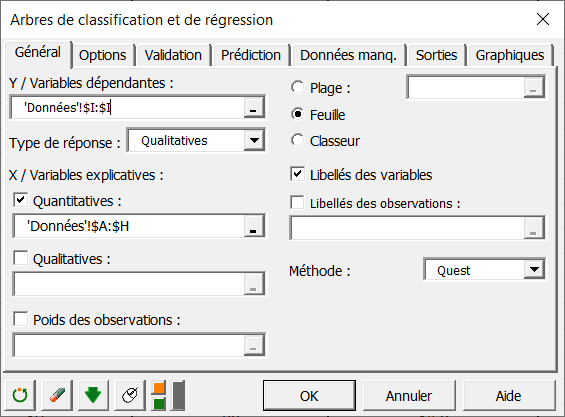 L'option Libellés des variables est laissée activée car la première ligne des colonnes sélectionnées comprend le nom des variables. Nous choisissons la méthode QUEST pour créer l'arbre.