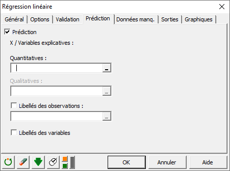 Une fois l’équation d’une régression linéaire établie, elle peut être utilisée pour prédire les valeurs de la variable dépendante en fonction de nouvelles valeurs des variables indépendantes. Ces valeurs peuvent être réelles ou inspirées d'un scénario futur. Par exemple, les revenus peuvent être prédits sur la base de scénarios hypothétiques impliquant des valeurs spécifiques de cours d’actions ou d’investissements marketing. Pour obtenir des prédictions à partir d’une régression dans XLSTAT, utilisez l'onglet Prédiction de la boîte de dialogue de régression linéaire.