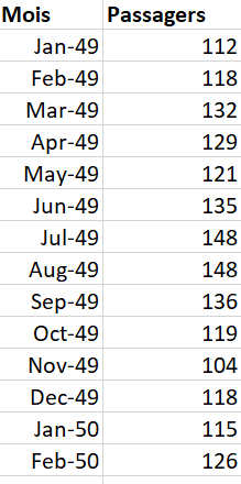 Vous trouverez ci-dessous un exemple de données mensuelles sur les passagers internationaux (en milliers) de l'aéroport de San Francisco de janvier 1949 à décembre 1960 [Box, G. E. P., Jenkins, G. M. and Reinsel, G. C. (1976) Time Series Analysis, Forecasting and Control. Third Edition. Holden-Day. Series G].