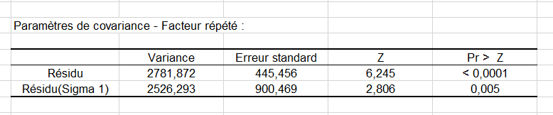 Le tableau suivant donne les paramètres de la matrice de covariance des erreurs (structure compound symmetry). Il y a ici deux paramètres estimés et tous deux sont significatifs.