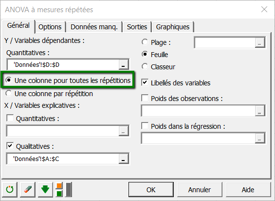 Les variables sujet et répétée doivent être aussi sélectionnées parmi les variables explicatives.