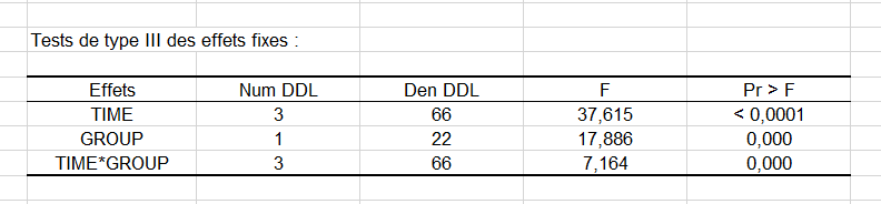 Nous voulons effectuer une ANOVA à mesures répétées en utilisant comme effets fixes les variables "time", "group" et "time*group".