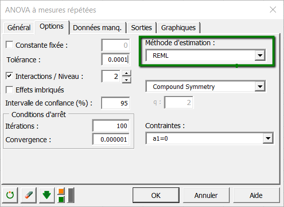 Sélectionnez la structure compound symmetry. Nous choisissons la contrainte a1=0, ce qui implique que le modèle s'écrira de façon à considérer que le groupe des contrôles (group=1) aura l'effet de base.