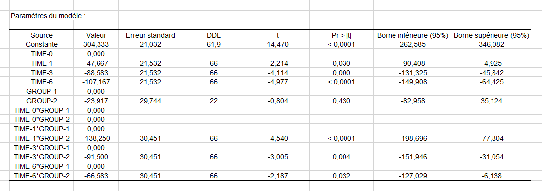 En analysant les paramètres du modèle, on voit qu'aux temps 1, 3 et 6, l’effet sur le score est négatif et que le fait d’être traité a un effet négatif sur le score. Le tableau ci-dessus peut être utilisé pour étudier l'impact des variables sur le score, mais aussi pour prédire des valeurs dans des situations qui n'on pas été rencontrées. Ainsi, d'après le modèle, on peut déterminer qu’un patient traité aura un score moyen de 107,1 au temps 6, tout en sachant que l'influence de l'interaction ne peut être prise en compte.