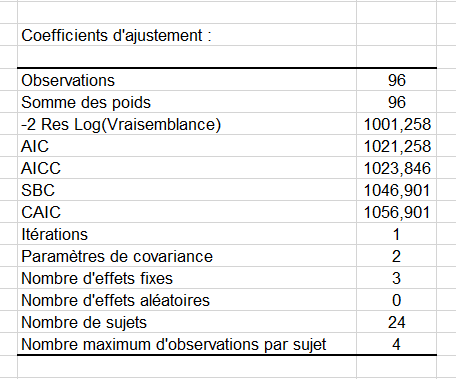 Les coefficients du modèle sont obtenus en utilisant le maximum de vraisemblance restreint (REML), on obtient donc des indices différents de ceux de l’ANOVA classique. Les AIC, AICC, SBC et CAIC sont des indices qui permettent de comparer des modèles en utilisant différentes structures de matrices de covariance.