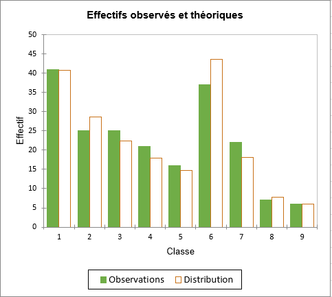 Le test du Khi’² permet de tester si la distance du Khi’² entre la distribution empirique et la distribution théorique, calculée sur les classes, n'est pas au-delà d'une valeur critique. La comparison visuelle des histogrammes théoriques et observés est possible sur la figure suivante.