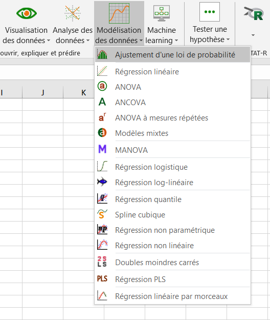 Pour ajuster une loi de probabilité à un échantillon, et tester la qualité de l'ajustement, choisissez la commande XLSTAT / Modélisation / Ajustement d'une loi de probabilité.