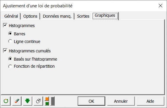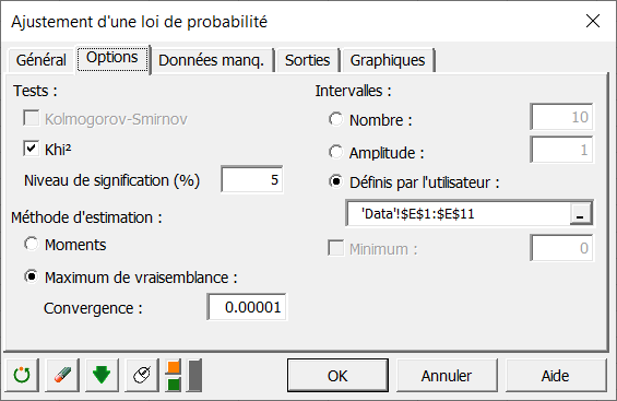 Dans le tableau des statistiques estimées, on peut comparer 4 statistiques élémentaires (moyenne, variance, asymétrie, et aplatissement), calculées à partir des données, et à partir des paramètres en utilisant les propriétés de la loi choisie.
