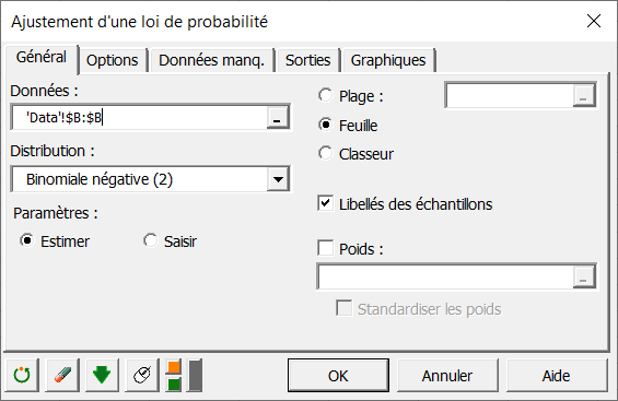Une fois le bouton cliqué, la boîte de dialogue apparaît. Vous pouvez alors sélectionner les données sur la feuille Données. Nous laissons XLSTAT libre d'estimer les paramètres de la loi binomiale négative. XLSTAT propose deux formulations de la loi binomiale négative. Celle qui est adaptée à ce type de données est la deuxième.
