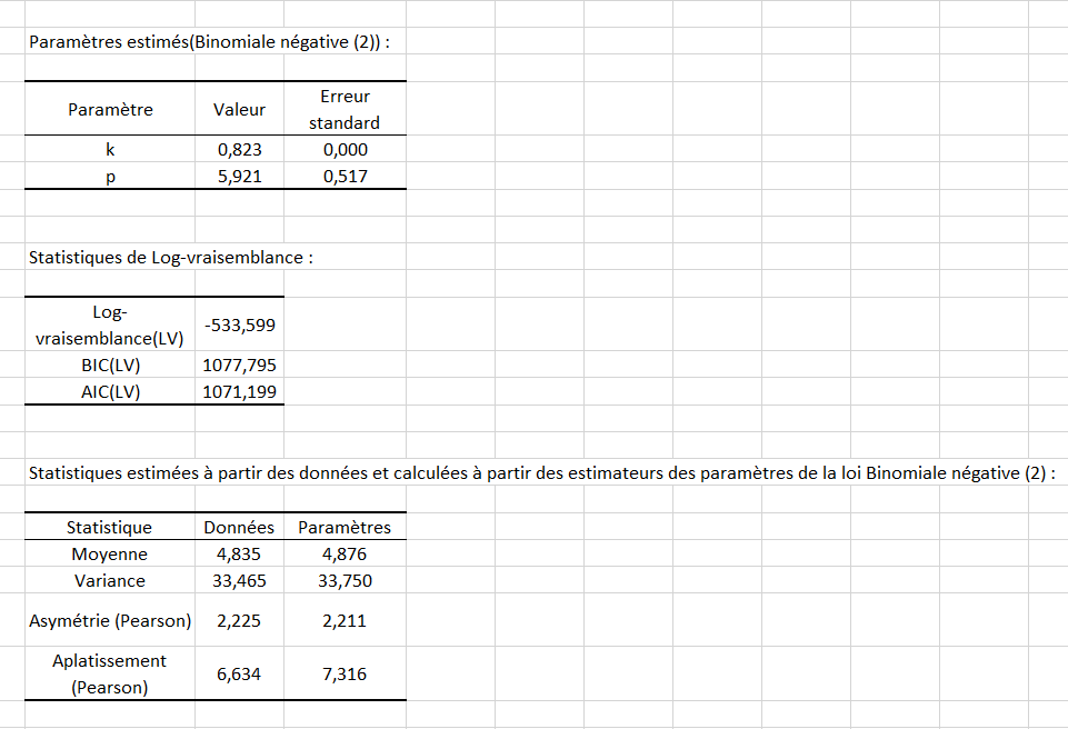 Le premier résultat qui nous intéresse est la valeur des paramètres k et p de la loi binomiale négative (ajustée par la méthode du maximum de vraisemblance) affiché dans le tableau Paramètres estimés.
