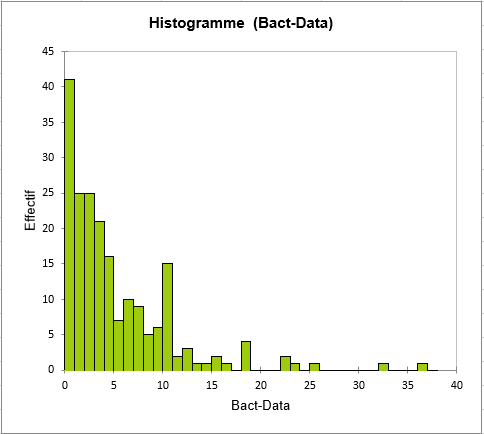 Les données correspondent à une expérience où 200 échantillons d'eau prélevés dans une rivière ont été mis en culture sur un milieu nutritif, afin de déterminer la présence ou non de bactéries de type Escherichia coli. Le nombre de colonnies a été compté après trois jours d'incubation. Dans la colonne "Bact-Data" se trouve le résultat des comptages pour chacun des 200 échantillons.