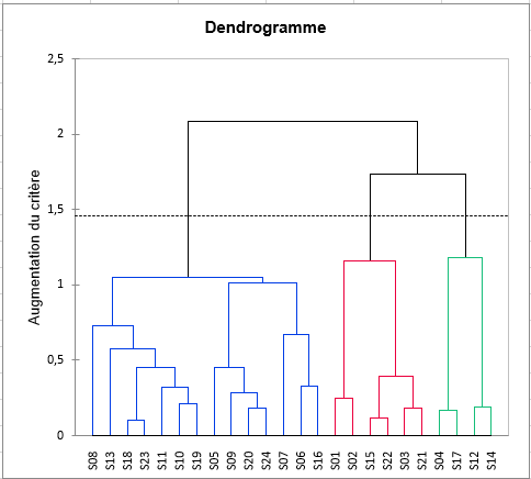 Le graphique ci-dessous est le dendrogramme. Il représente de manière claire la façon dont l'algorithme procède pour regrouper les configurations puis les groupes de configurations. L'algorithme a progressivement regroupé toutes les configurations (sujets). La ligne en pointillé représente la troncature et permet de visualiser que trois classes ont été identifiées.
