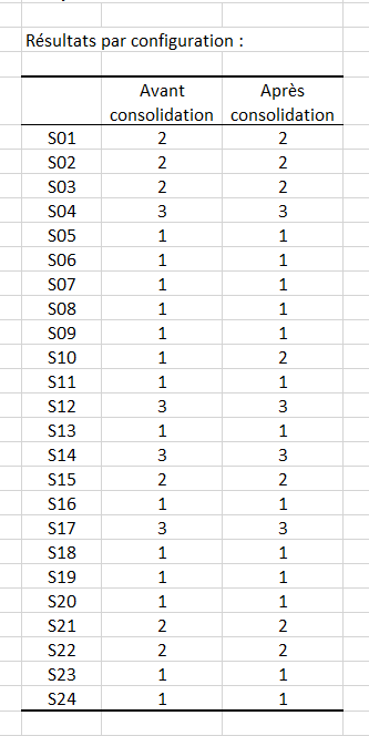 Le tableau suivant indique les classes des différentes configurations avant et après consolidation. Il apparaît que seul le sujet 10 a changé de classe avec la consolidation.