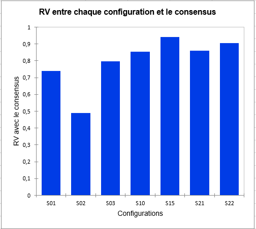 Le graphique suivant donne des indications sur la proximité des configurations et du consensus de la classe dans laquelle elles sont placées. Ces proximités sont représentées par le coefficient RV, qui est un indice de similarité entre 0 et 1. Dans la classe 2, nous pouvons observer que le sujet 2 est bien plus éloigné du consensus que les autres, ce qui signifie qu’il ne se conforme pas bien à la classe. Sa perception est différente de toutes les classes (puisqu’il a été placé dans la classe qui lui correspond le mieux par l’algorithme). Ce genre de problématique peuvent être résolues par l’ajout de la classe « K+1 » dans l’onglet Options, qui est une classe supplémentaire prévue pour mettre de côté les configurations atypiques.
