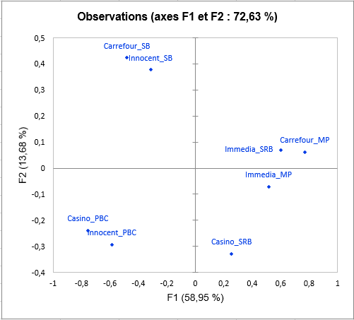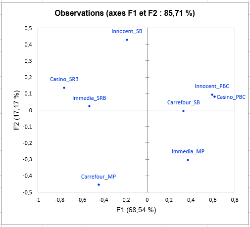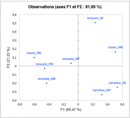 Viens ensuite l’analyse de chacune des classes construites. La représentation des objets (smoothies ici) dans chaque classe montre des différences de perception entre les classes de sujets, notamment concernant le smoothie Carrefour_SB. En effet, ce dernier est placé avec le smoothie Innocent_SB par les sujets dans la classe 1, avec Innocent_PBC et Casino_PBC par les sujets dans la classe 2, et avec Carrefour_MP par ceux de la classe 3.