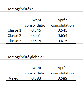 Enfin, les indices d’homogénéité de chaque classe permettent d’évaluer la qualité de la classification. Plus ces indices sont proches de 1, plus les classes sont homogènes. Ici, nous voyons que la classe 1 est un peu moins homogène que les autres. L’homogénéité globale, qui est une moyenne pondérée des homogénéités de chaque classe, est plutôt correcte. Cependant, cette dernière pourrait être améliorée avec l’ajout d’une classe « K+1 ».
