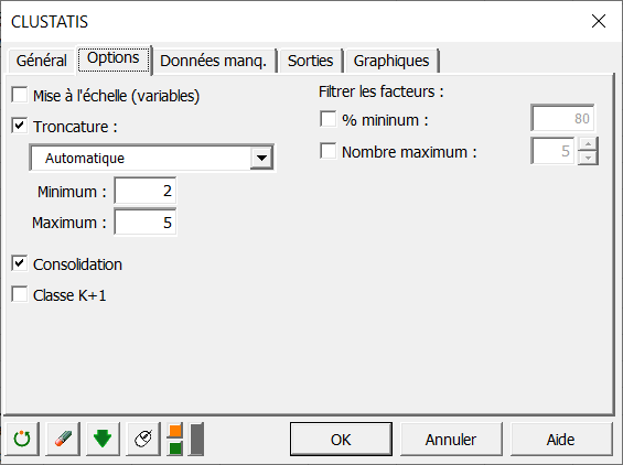 Dans l’onglet Options, nous avons choisi de ne pas réduire les variables, puisqu’à l’intérieur de chaque configuration, toutes les variables sont sur la même échelle. Nous avons décidé de laisser le choix du nombre de classes automatique, et d’appliquer une consolidation des classes obtenues par l’algorithme hiérarchique afin obtenir une classification plus précise.