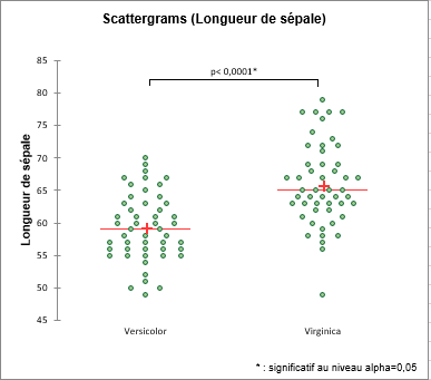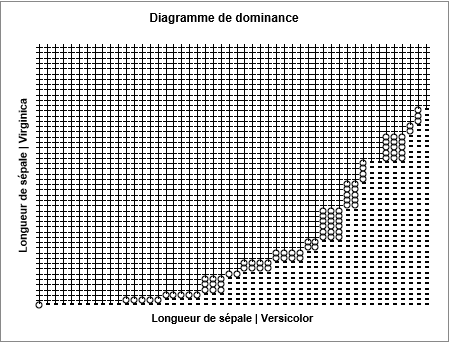 Le diagramme de dominance permet de comparer visuellement les deux échantillons. Le premier échantillon est représenté sur l'axe des abscisses et le second sur l'axe des ordonnées. Ici l'on peut voir que la longueur des sépales est plus importante pour l'espèce Virginica.