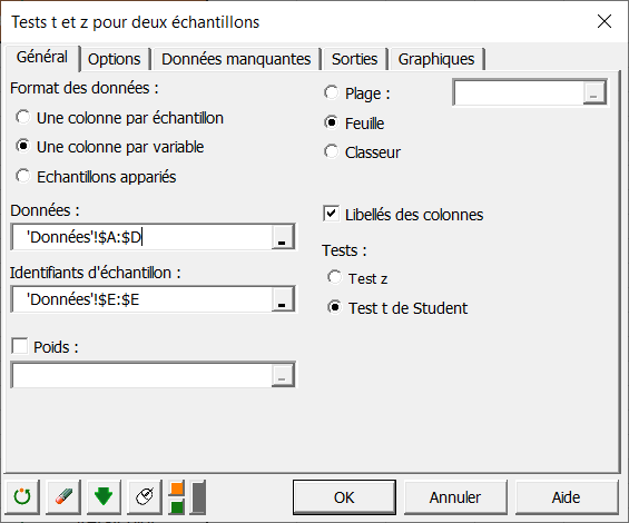 Le format des données est une colonne par variable car les données pour les deux échantillons sont dans le même tableau. L'option une colonne par échantillon correspond au cas où les données sont dans des tableaux différents par échantillon. La troisième option correspond au cas où les échantillons sont appariés.