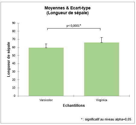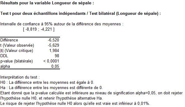 Ci-dessous sont les résultats pour la première variable : Longueur Sépales. Le test présente une p-value inférieure au seuil de 5% on peut donc rejeter l'hypothèse nulle et conclure que la longueur des sépales est significativement différente entre les deux espèces.