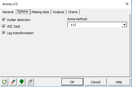 Dans l’onglet Options, vous pouvez choisir de cocher ou non les options de détection des outliers, de transformation logarithmique de la série temporelle, et d’utilisation de tests AIC pour détecter les jours de bourse et les effets de Pâques. Vous pouvez également choisir d’utiliser la procédure alternative X-11 d’ajustement de modèle. Ici, nous choisissons de conserver toutes ces options, et d’utiliser la procédure X-13ARIMA-SEATS.