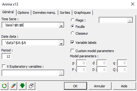 Dans l’onglet Général, Sélectionnez la colonne B, le taux de personnes sans emplois, dans le champ Time Serie. Sélectionnez la colonne A, le mois et l’année de l’observation, dans le champ Date data. Le champ Period correspond au nombre d’observations par unité de temps. Nous renseignons ici 12, puisque l'on travaille année par année, et que nous disposons d'une observation par mois. Il est possible de cocher l’option Cutsom model parameters pour renseigner ses propres valeurs pour chaque paramètre du modèle. Si cette option n’est pas cochée, la procédure X-13ARIMA-SEATS sélectionne elle-même les paramètres automatiquement, c’est ce que nous choisissons ici.