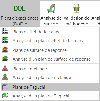 Une fois XLSTAT lancé, cliquez sur l’icône DOE et choisissez la fonction Plans de Taguchi.