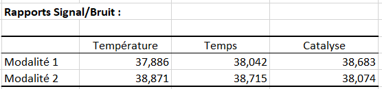 Le premier tableau qui va nous intéresser ici est le tableau des rapports signal sur bruit. Le rapport signal sur bruit permet d’améliorer la robustesse du produit, le but est de le maximiser, plus le rapport signal sur bruit sera élevé, plus robuste sera le produit.
