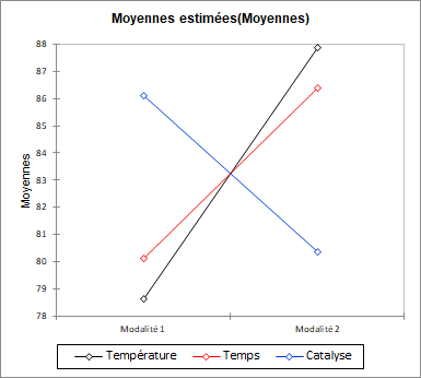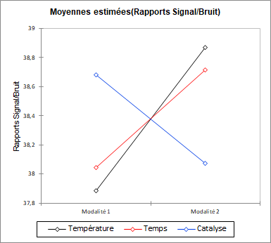 On peut donc conclure, pour cet exemple, qu’une température ambiante de 24 degrés a l’influence la plus importante sur le pourcentage de zinc dans la peinture, à la fois sur le rapport signal sur bruit et sur la moyenne. Un temps d’application de 70 minutes arrive ensuite, suivi d’un volume de catalyse 94 litres. Dans cet exemple on choisirait donc de faire une peinture avec les paramètres de facteurs suivants :