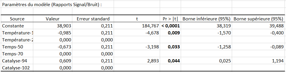 Ensuite, afin de déterminer les facteurs qui sont statistiquement significatifs on peut regarder l’analyse de la variance réalisée sur les rapports signal sur bruit.