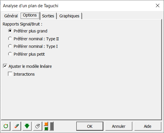 Dans cet exemple, nous souhaitons maximiser le pourcentage de zinc, nous choisissons donc d’utiliser un rapport signal sur bruit « plus grand est le mieux ». Nous choisissons aussi d’ajuster le modèle linéaire.