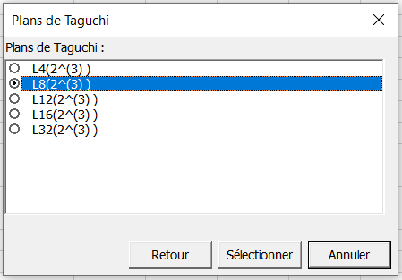 Une seconde boite de dialogue apparaît alors, avec les différents plans de Taguchi réalisables. Sélectionnez le plan L8 qui permettra de réaliser 8 expériences différentes.