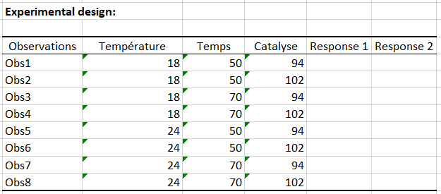 - Plan de Taguchi : cette feuille contient le plan de Taguchi ainsi que les réponses.