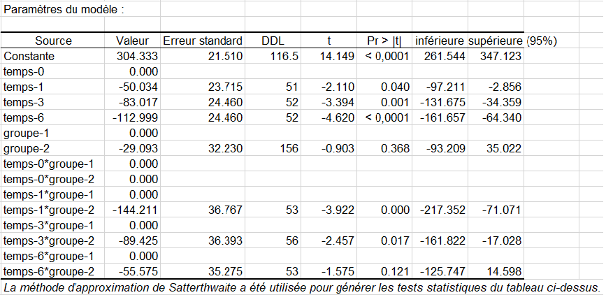 La méthode d’approximation de Satterthwaite a été utilisée pour le calcul des degrés de liberté du dénominateur ainsi que de la statistique F afin de calculer une pvaleur (Pr > F) plus précise et diminuer ainsi l’erreur de type I sur l’hypothèse testée (égalité de la différence des « Moyennes Estimées »)