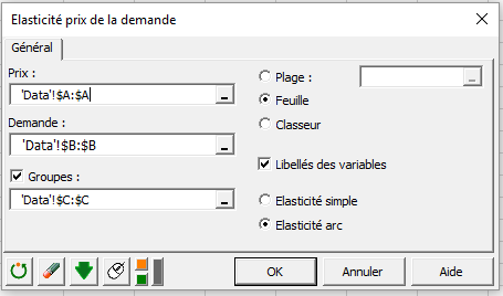 Dans l’onglet Général, sélectionnez respectivement les colonnes A, B et C dans les champs Prix, Demande et Groupes. Dans notre exemple, nous choisissons de calculer l’élasticité arc. Après avoir cliqué sur OK, une série de tableaux et de graphiques sont affichés.