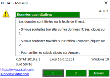 Une nouvelle fenêtre apparaît. Cliquez sur 1 afin de travailler sur les données filtrées au lieu du tableau complet.