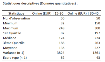 Les données correspondent aux résultats d’une enquête sur le montant dépensé en moyenne, dans le commerce en ligne par mois. Les répondants sont représentés en lignes et les réponses ainsi que la classe d’âge de chaque répondant en colonnes.