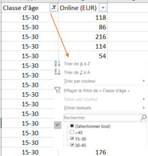 Des flèches de filtrage sont automatiquement ajoutées aux en-têtes de tableau. Sélectionnez la flèche d’en-tête de colonne Age. Décochez la catégorie >45 et cliquez sur OK.