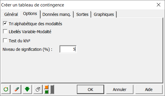 Allez à l'onglet suivant : Options. Vous pouvez décider de la façon de traiter des modalités ainsi que décider si vous voulez calculer un test du khi².