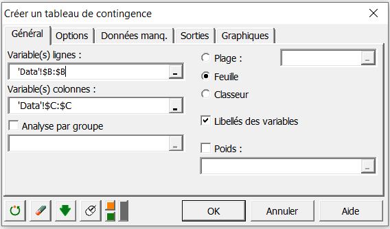 Les résultats sont affichés dans une nouvelle feuille nommée Tableau de contingence.