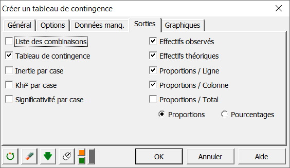 Dans l'onglet Sorties vous pouvez décider des résultats à calculer. Ici on choisit le tableau de contingence aisni que les effectifs observés et théoriques.