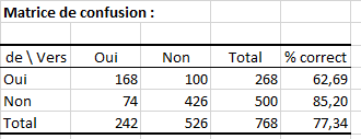Les deux premiers tableaux regroupent les statistiques descriptives des différentes variables et le tableau des corrélations. En dessous est affichée la matrice de confusion qui résume l'information des reclassements d'observations, et qui permet de déduire les taux de bons et mauvais classements. Le "% correct" correspond au rapport du nombre d'observations bien classées sur le nombre total d'observations. Ici il est égal à 77,3%.