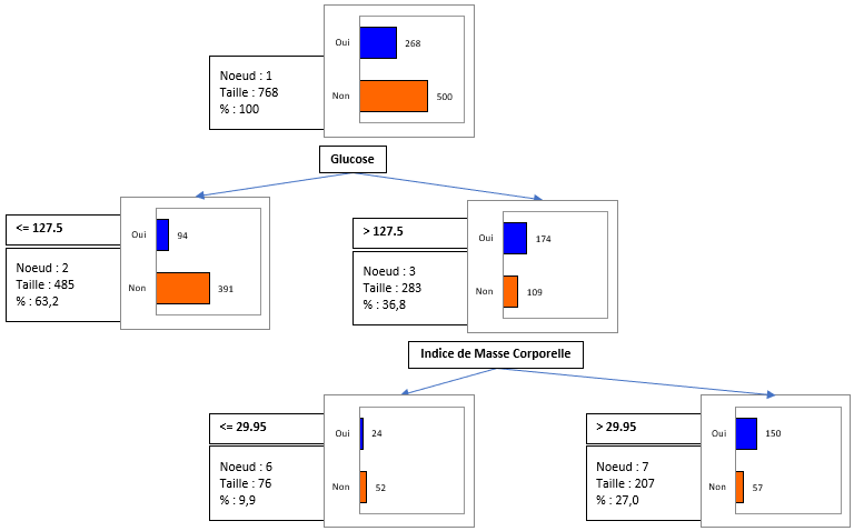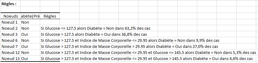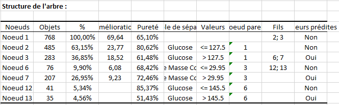 Ainsi on voit que : "Si Glucose <= 127.5 alors Diabète = No dans 63,2% des cas", cette règle est vérifiée pour 485 individus (63% des données) avec une pureté au niveau du nœud de 80,6% comme indiqué dans le tableau structure de l’arbre.