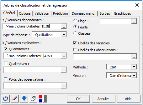 La boîte de dialogue apparaît, vous pouvez commencer la sélection des données sur la feuille Excel. On sélectionne la variable dépendante, qui est dans ce cas précis la variable qualitative binaire "Diabète" qui vaut "Oui" si le patient est atteint de diabète et "Non" sinon. Les variables explicatives sont les huit variables descriptives restantes. L'option Libellés des variables est laissée activée car la première ligne des colonnes sélectionnées comprend le nom des variables. Nous choisissons la méthode C&RT pour créer l'arbre.