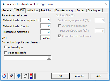 Ensuite, pour ne pas avoir un arbre trop complexe, nous précisons dans les options que nous ne voulons pas que la profondeur de l'arbre dépasse 3 et fixons la valeur du paramètre de complexité (CP) à 0,001. Cela signifie que la construction de l’arbre ne se poursuit pas à moins de réduire l'impureté globale de l’arbre d'au moins un facteur CP. Les options permettent d'ajuster plusieurs paramètres ayant une incidence sur la construction des arbres.